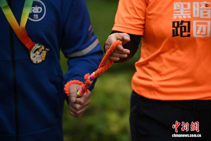 10月15日,太原市“暗跑团”跑者举办国际盲人日跑步活动。视障人士通过跑步绳与志愿者联系起来运行。中新网记者 魏亮 摄